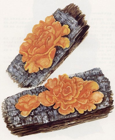 型态描述:担子果橙黄色,宽6-7厘米,由中空的瓣片所组成,子实层生于子实体表面。担子卵形,浅黄色,14-16×10-12微米,生于近子实体的表面。孢子球形,具小尖,直径6-7微米。