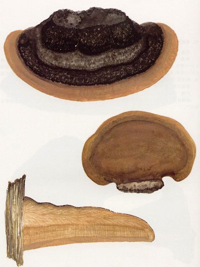 型态描述:子实体无柄,菌盖半圆形,扁平,5-8×7-16厘米,厚0.8-2.5厘米,木栓质至木质,黄褐色,后期变为灰黑色,有较宽的同心环棱。边缘钝,生长期间膨大并有绒毛,后期变保菌肉厚0.5-1厘米,锈褐色,后期呈咖啡色,有环纹。菌管多层,但层次不甚明显,每层厚2-3毫米,与菌肉同色,内部灰色。管口色较暗,生长期间带紫色,壁厚,圆形,每毫米5-6个。孢子无色,光滑,近球形,直径5微米。刚毛多,披针形,20-32×5-7.5微米。