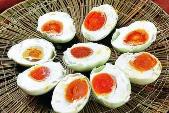 注解:成鸭蛋是经过腌制的鸭蛋。品质优良的威鸭蛋具有“鲜、细、松、沙、油、香”六大特点,煮后切开断面,黄白分明、蛋白质地细嫩,蛋黄细沙,呈橙黄或朱红色起油,周围有露状油珠,中间无硬心,味道鲜美。咸鸭蛋富含脂肪、蛋白质以及人体所需的各种氨基酸和钙、磷、铁等各种矿物质。而且,咸鸭蛋中含钙量很高,约为鲜鸡蛋的10倍。
