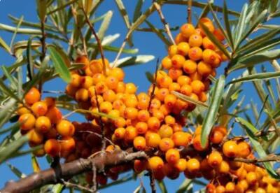 注解:沙棘属胡颓子科植物。沙棘含蛋白质、脂肪、粗纤维、碳水化合物、胡萝卜素、维生素B、维生素B、维生素C、烟酸等。此外,还含有异鼠李素、亚油酸、亚麻酸、叶酸、苹果酸、硬脂酸、油酸、玉蜀黍黄素、棕榈酸等。