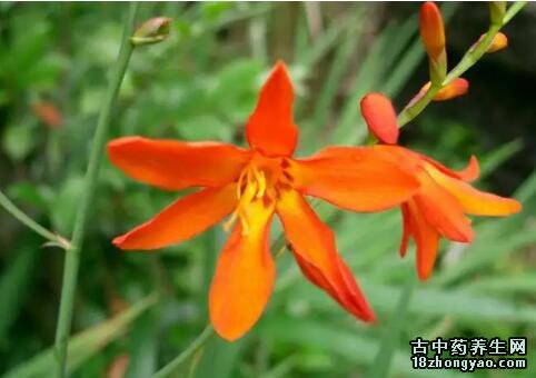 火星花形态:多年生草本。具扁球茎,叶多基生,剑形,基部有抱茎叶鞘。花茎常2~4分枝,由多花组成疏散的穗状花序,花多数。花冠漏斗状,深橙红色。果为三棱状球状蒴果。花期7~8月,果期8~10月。