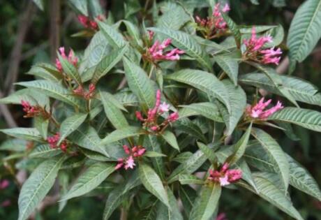 原植物:鸡骨常山为直立灌木,多分枝。茎灰褐色。单叶无柄,3~5枚轮生,长圆状披针形或倒卵状披针形,先端渐尖,基部渐狭窄,全缘,上面绿色,下面灰绿色,被疏短柔毛,叶腋内外密生腺体。伞房状聚伞花序顶生或近顶腋生,粉红色。花萼短,5裂;花冠高脚碟状,花冠筒中部膨大;雄蕊5,内藏于花冠管喉部,不伸出;花盘为2枚舌状鳞片组成;心皮2;菁英果2,离生,3cm。种子两端被极短柔毛。